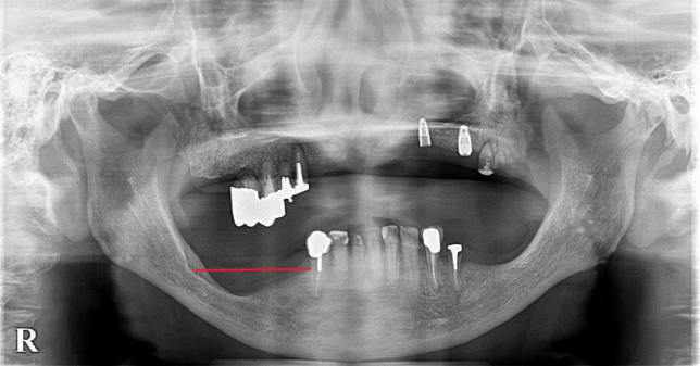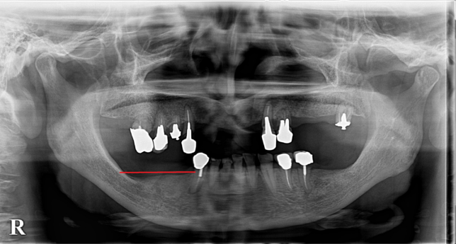 赤い線より下部分の骨が痩せています。7年前より骨の高さが減っているのが分かるでしょうか?